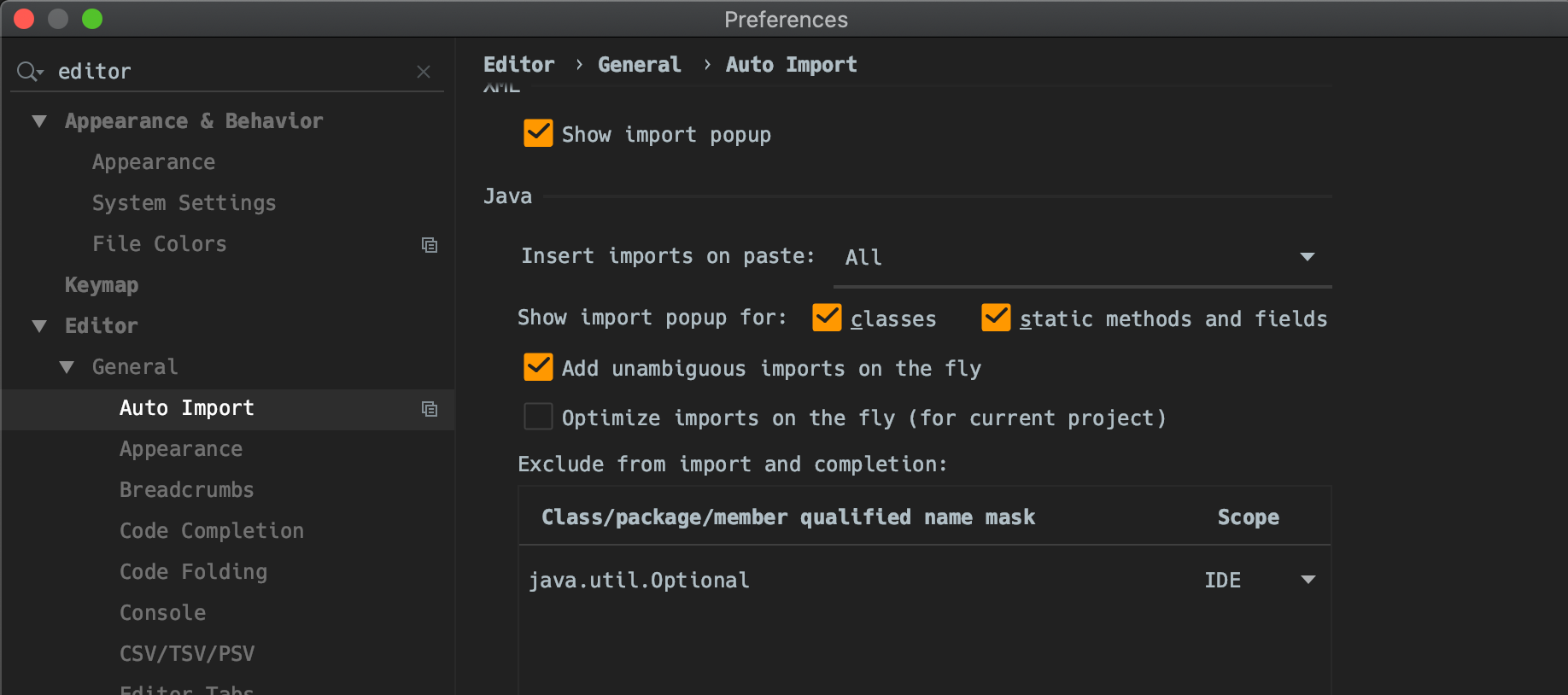 Preferences > Editor > General > Auto Import 여기에서 Exclude from import and completion에 보면 java.util.Optional이 등록이 되어 있다.
